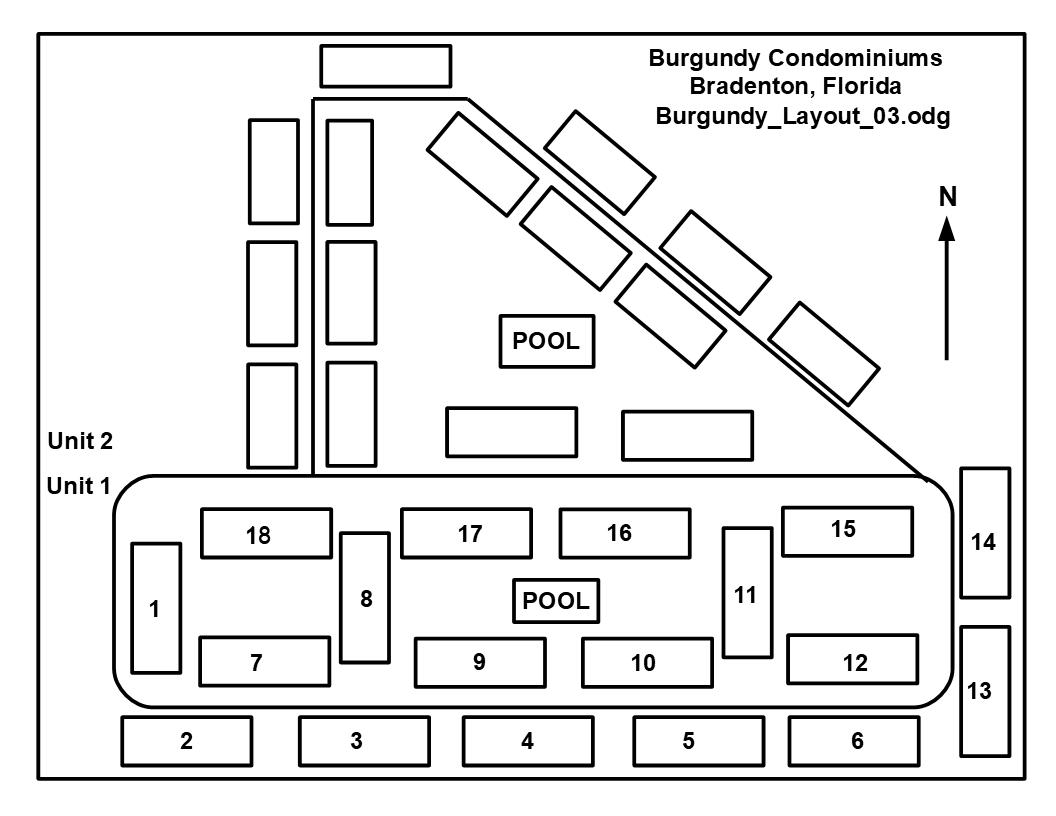 Our condominium association is a 55+ condo community in Bradenton, Florida.  It is comprised of 246 residential units in 18 2-story buildings built in 1977.  Unit 2 (to the north) does not belong to Unit 1.  Sales of condominiums must be approved by the association.  There is a limit to the number of condominium units (2) that may be owned by any one individual.